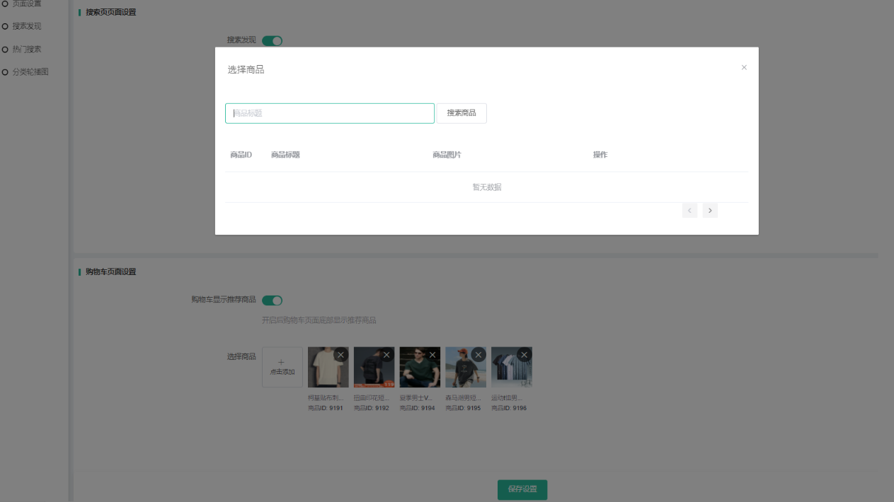 页面设计功能 帮助平台打造人货相遇新触点。搜索页显示搜索发现、热门搜索;分类页显示顶部图片;购物车显示推荐商品。仅支持小程序端。